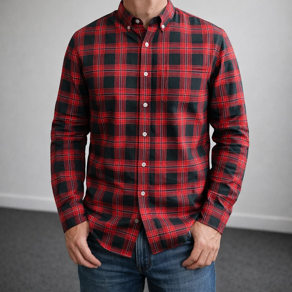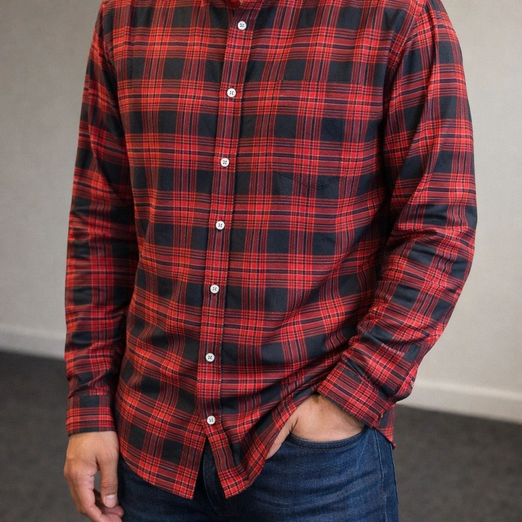 پیراهن آستین بلند مردانه چارخونه رنگبندی قرمز و زرد قواره استاندارد (راهنمای سایزبندی اسلاید اخر) تمام نخ
